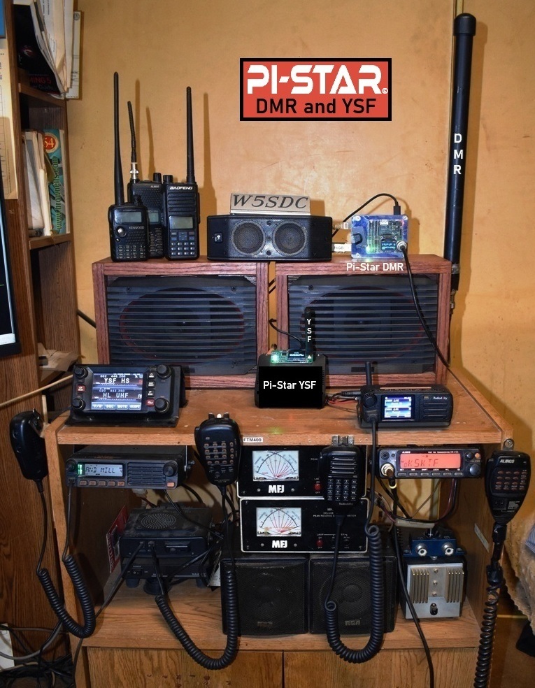 This station is located approx 25 miles NW of Austin, Texas. RF capabilities include analog VHF/UHF local metro coverage on the 2m, 70cm, and 220Mhz FM bands. VoIP digital radio communications worldwide are made possible using two Pi-Star hotspots making access to DMR talkgroups available from both DMR and YSF transceivers. For direct access to Wires-X® rooms and nodes, the Yaesu FTM-400 is powered up into direct mode and a Windows PC running the Wires-X® app is used without a need for transmitting any RF because the radio's voIP packets are transmitted directly to the internet from the PC.